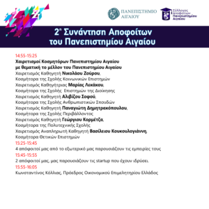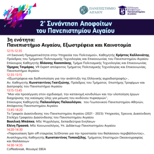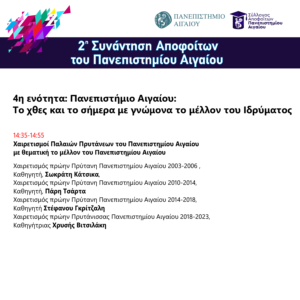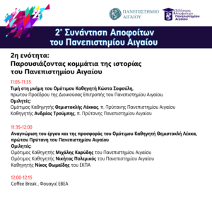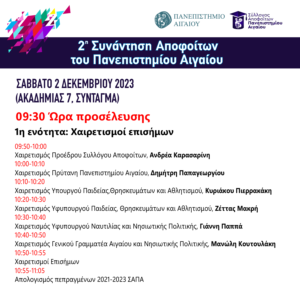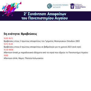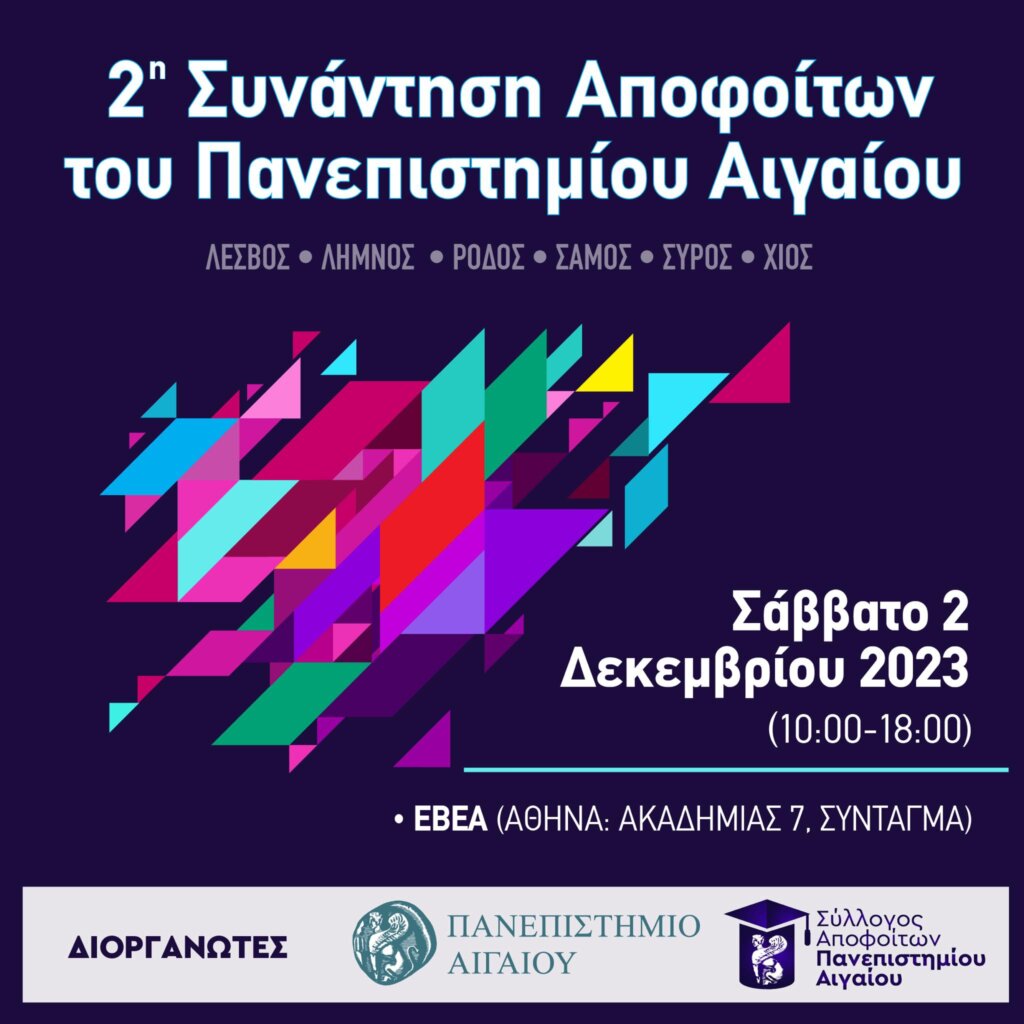 Ο Σύλλογος Αποφοίτων του Πανεπιστημίου σε συνεργασία με το Πανεπιστήμιο Αιγαίου πραγματοποιούν τη 2η Συνάντηση των Αποφοίτων του Αιγαίου στις 2 Δεκεμβρίου στην Αθήνα (ΕΒΕΑ, Ακαδημίας 7 Σύνταγμα) .